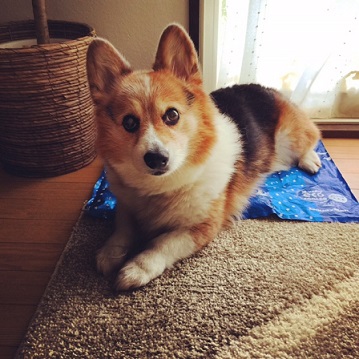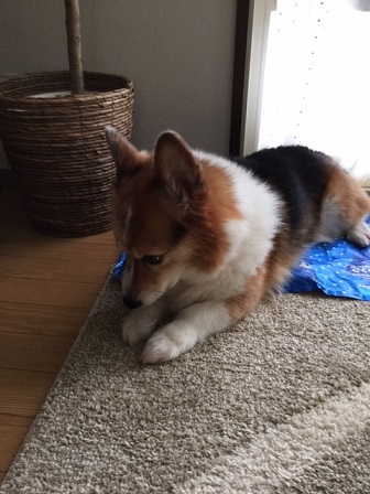 食べ終わっても、空容器を離しません冷え冷えマットの上です、わんわんシャーベットを食べて、涼しい顔のジョンです