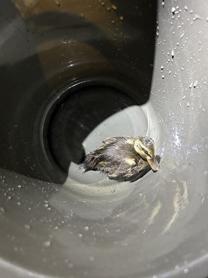さっき見たカモの他にピーピー小さい声が聞こえると思ったら、溝に赤ちゃんのカモが!