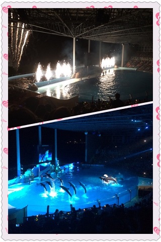 イルカショーは素晴らしい演技と共に、ライトや音楽、