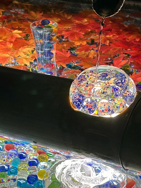 もみじが添えられたビー玉の手水も、キラキラとしてかわいかったです😍