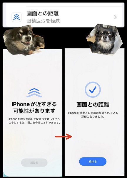 目から画面を離してベストな距離になると『続ける』のボタンが押せるようになり、