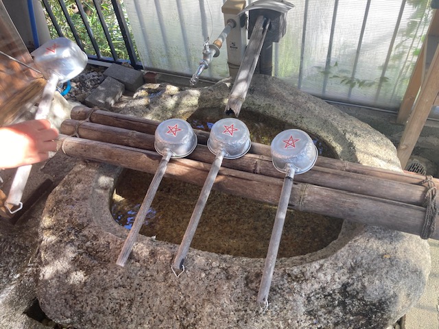 境内に入ってまず目に入るのが、五芒星入りの柄杓が並ぶ手水舎。