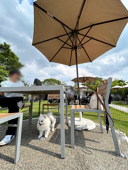主人と時間潰しにとカフェのテラスサークル席を予約し、スフレも連れて行って来ました💖