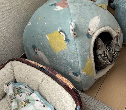 秋冬仕様に変わったお気に入りベッドにそそくさと入って見送るクロムです