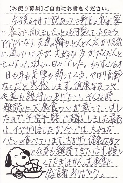 京都府 木倉ジーコくん(シーズー・15歳) 生後6ヵ月で、訳あって二軒目の我が家へ養子に向えました。とても可愛くて、たちまちアイドルになり、友達の輪もどんどん広がり、元気に過していましたが、大好きな友がだんだんと亡くなって、淋しい日々でした。もうすぐ16歳。目も耳も足腰も弱ってくる。やはり高齢なのだと実感します。健康な皮フや毛並みも維持してあげたい。そんな時雑誌に「犬康食・ワン」が載っていましたので、半信半疑で購入しました。最初はイヤガリましたが、今では大好きなパンと食べています。おかげで健康な皮膚と毛並みも維持できています。嬉しくてたまりません。犬康食に感謝ありがとう。お便りの文面からもうすぐ16歳になるジーコくんとご家族が過ご してこられた日々が思い浮かぶようです。楽しい毎日に『犬康食・ワ ン』がお役に立てて嬉しく思います。これからも、元気で長生きがずっ と続きますように!
